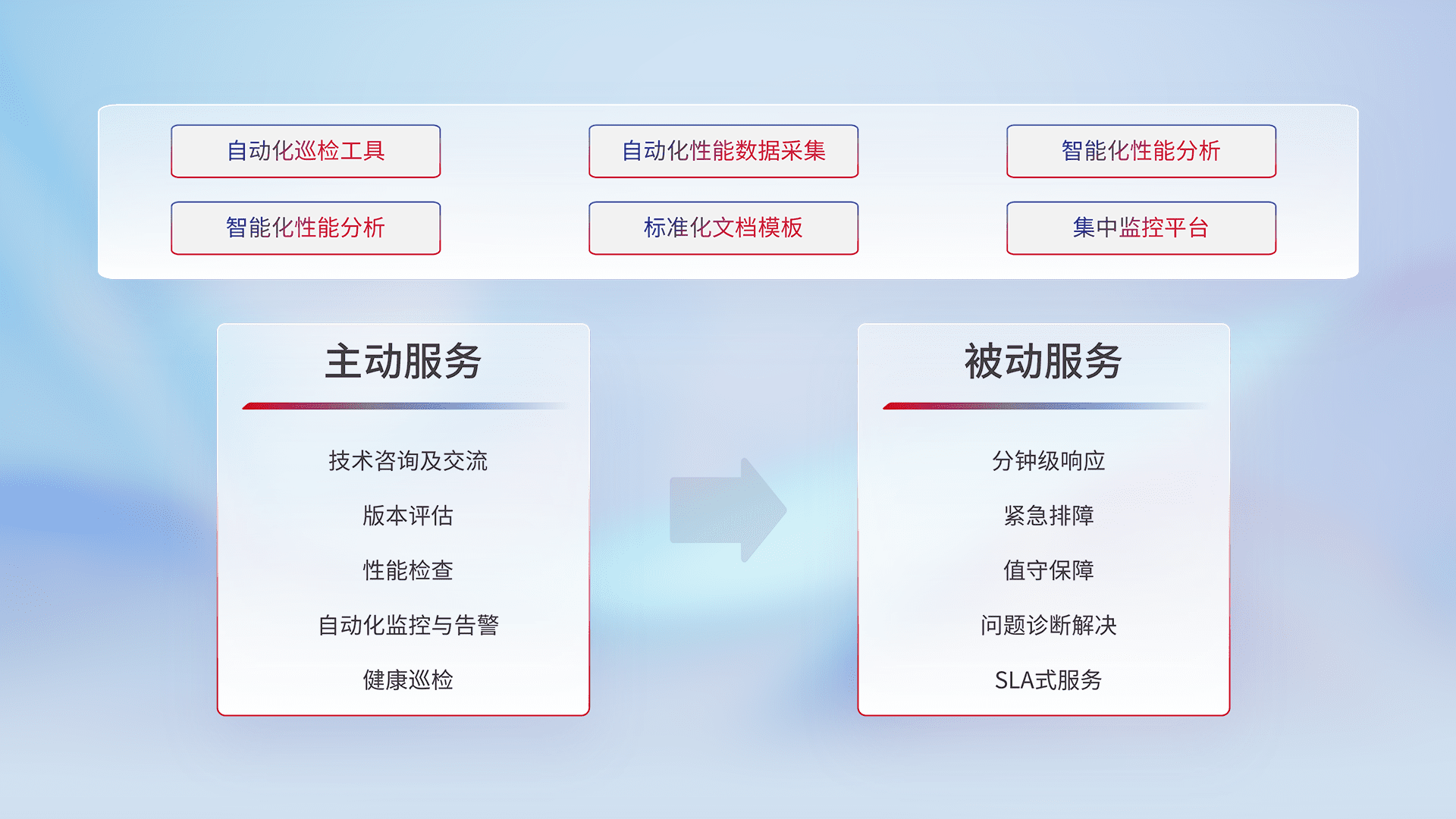 智能化工具和标准化文档,,,保障服务质量,,,,提供主动服务(包含技术咨询、、版本评估、、、、性能检查、、自动化监控与告警、、、健康巡检)和被动服务包含(分钟级响应、、、紧急排障、、、值守保障、、问题诊断解决、、SLA服务)。。